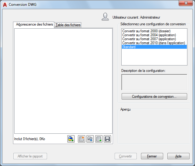 Ouvre une boîte de dialogue standard de sélection de fichiers, qui vous permet de sélectionner les fichiers dessin à ajouter à la liste de conversion. Ce bouton est disponible dans les onglets Arborescence des fichiers et Table des fichiers.