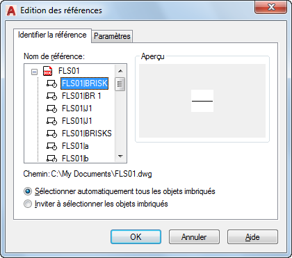 Pour sélectionner une référence à modifier, sélectionnez un objet dans la référence. Si vous sélectionnez un objet qui fait partie d'une ou de plusieurs références imbriquées, celles-ci sont affichées dans la boîte de dialogue.