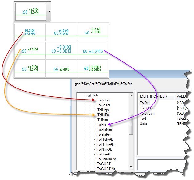 Les miniatures des tolérances de la liste Tolérance correspondent aux huit premières entrées sous Acad/M > DimSet >Tolérance, dans l'Editeur système. Le nom de ces entrées commence par "Tol" (par ex., TolHigh). Les autres entrées se rapportent à la représentation des tolérances dans une unité alternative et leurs noms finissent par "-Alt". Par exemple, TolHigh-Alt est la représentation dans une unité alternative de TolHigh.