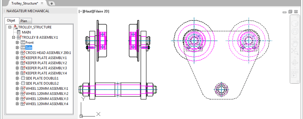 Dans cet exemple, l'ensemble TROLLEY possède deux vues qui sont affichées dans l'espace objet et le navigateur Mechanical. La vue sélectionnée dans le navigateur Mechanical est mise en surbrillance dans l'espace objet.