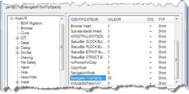 Dans l'Editeur système, dans la branche Acad/M > CIT, l'identificateur NavigationToolTipOpacity contrôle l'opacité de l'info-bulle. Cet identificateur contient le pourcentage d'opacité : la valeur 100 signifie que l'info-bulle est opaque, tandis que 0 signifie qu'elle est totalement invisible.