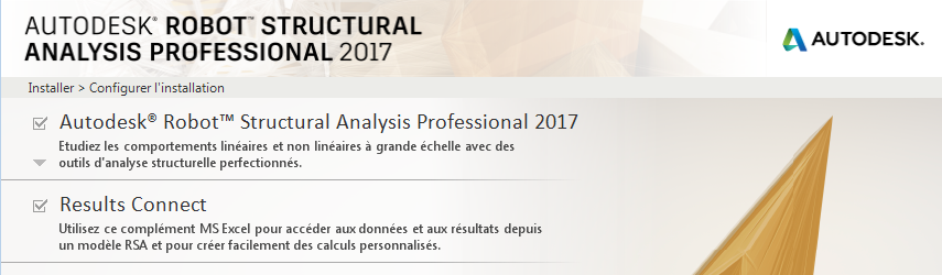 Cliquez sur la bande Autodesk Robot Structural Analysis Professional de la page Install > Configure Installation du programme d'installation pour afficher la zone de configuration. Les fonctionnalités facultatives y sont répertoriées, la plupart d'entre elles étant présélectionnées pour l'installation.