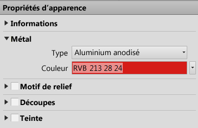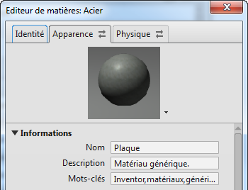 Les définitions de matières comportent plusieurs aspects. Autodesk Inventor en utilise deux, l'apparence et le physique. Chacun comporte des propriétés spécifiques qui contribuent à la définition de la matière.