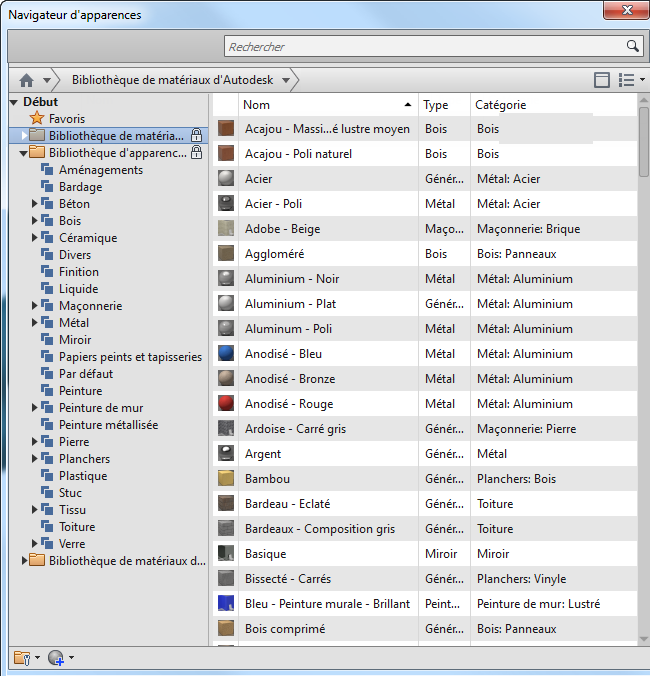 Autodesk Revit est le seul produit à utiliser tous ces aspects. Inventor utilise les aspects physiques et d'apparence. AutoCAD utilise uniquement l'apparence. Une matière peut posséder plusieurs ressources, mais toutes de différent aspect. Par exemple, elle ne peut pas posséder deux ressources physiques.