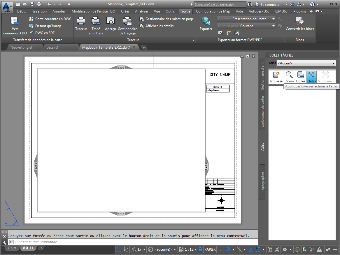 Après avoir défini le gabarit d'atlas et enregistré votre carte, vous pouvez publier l'atlas dans un traceur ou dans un fichier DWF.