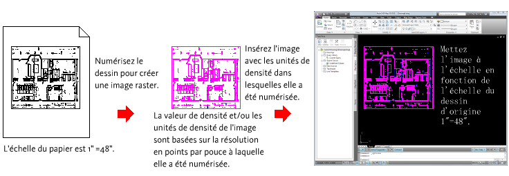 L'image dans l'exemple ci-dessous a été dessinée à une échelle papier de 1" = 48", numérisée à 300 points par pouce et insérée dans un dessin en utilisant la valeur de densité de 300 et le pouce comme unité de densité. Ensuite, sa taille a été modifiée en fonction de l'échelle papier 1" = 48".