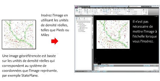 L'unité de densité que vous définissez peut varier en fonction du type d'image à insérer. Les deux exemples ci-dessous expliquent les différences existant entre l'insertion d'une image numérisée en utilisant des points par pouce et l'insertion d'une photo aérienne/satellite enregistrée en utilisant une unité réelle.