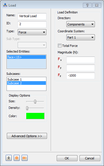 - Modifiez le Nom en Vertical Load. Sélectionnez le même trou que celui utilisé pour la charge précédente et assurez-vous que l'option Sous-cas 2 est sélectionnée dans la liste Sous-cas. Sous Définition de charge, saisissez -1000 dans le champ FZ et cliquez sur OK.