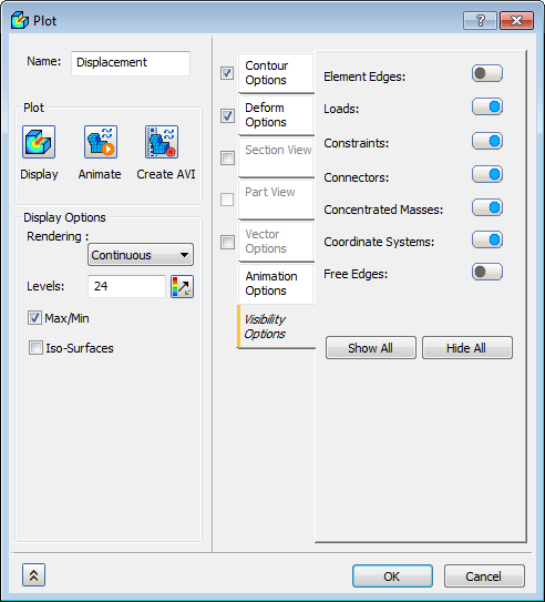 - La troisième ligne décrit le contour affiché. Dans ce cas, il s'agit du déplacement total. Essayez de cliquer à nouveau deux fois sur le tracé de contour dans l'arborescence. L'affichage retourne au tracé de maillage non déformé.