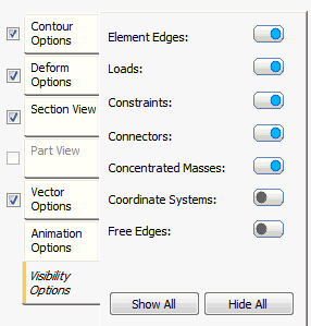 Arêtes libres : lorsque cette option est activée (de couleur bleue), elle affiche les arêtes libres pour les éléments coques. Le programme superpose une ligne blanche épaisse sur les arêtes libres. Les arêtes libres sont celles qui ne sont associées à aucune arête d'un élément de type coque adjacent. Cette option est utile pour trouver des éléments de type coque mal connectés à l'endroit où les faces se recoupent.