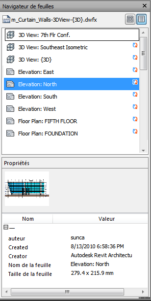 La palette des feuilles/modèles répertorie l'ensemble des feuilles et des modèles contenus dans le fichier de plusieurs feuilles. Le libellé en haut de la palette indique le fichier actuellement ouvert dans Autodesk Navisworks. La feuille/le modèle peut être représenté sous forme de liste ou de miniature. Par défaut, l'ordre d'affichage est le même que celui du fichier d'origine. La feuille/le modèle actuellement sélectionné est indiqué par un arrière-plan ombré, tandis que la feuille/le modèle actuellement ouvert dans la vue de scène est indiqué par une bordure graphique noire. Lorsque vous ouvrez un fichier de plusieurs feuilles, certains modèles/feuilles n'ont peut-être pas été préparés en vue d'une utilisation dans Autodesk Navisworks. Les feuilles/modèles qui nécessitent une préparation sont indiqués par l'icône Préparer