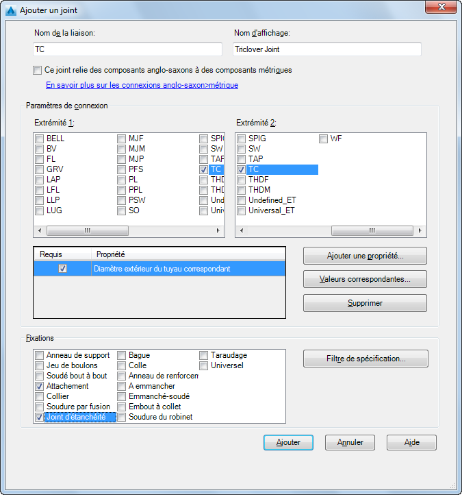 Les types de liaison prenant en charge les connexions en unités anglo-saxonnes/métriques se distinguent des types de liaison utilisant les mêmes unités. Cela vous permet de définir des propriétés correspondantes telles que 150#, 10PN.