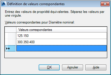 Identifie les valeurs de propriété compatibles. Vous pouvez ajouter des valeurs séparées par une virgule sur chaque ligne (p. ex. 125, 150) pour indiquer une correspondance.