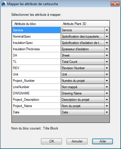 Associe les attributs de cartouche à des propriétés Plant 3D.