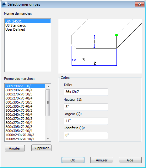 Spécifie la norme de marche, la forme des marches et les cotes de l'escalier.
