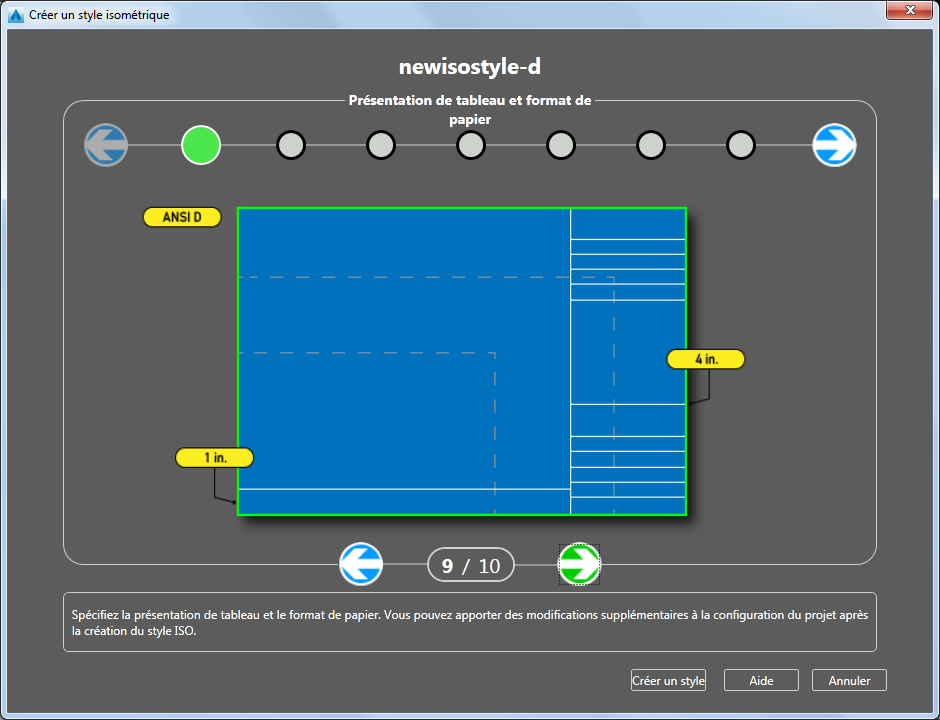 Dans la partie inférieure, cliquez sur les flèches de gauche et de droite pour sélectionner la présentation des tableaux et la taille de la feuille. Par exemple, ANSI D avec une zone de nomenclature de 4 pouces sur la gauche.