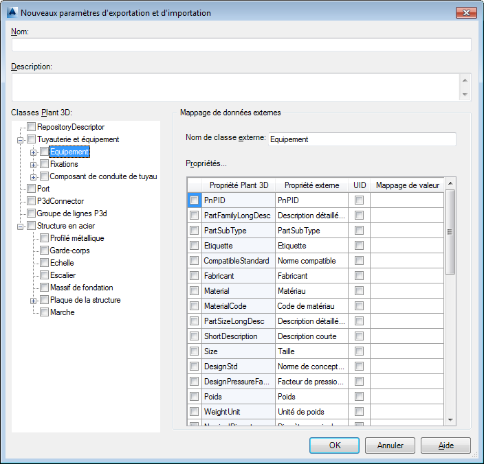 Affiche la liste des propriétés associées à la classe sélectionnée. Des cases à cocher permettent de déterminer les propriétés à inclure dans les fichiers exportés ou importés. Vous ne pouvez pas modifier la propriété P&ID. |