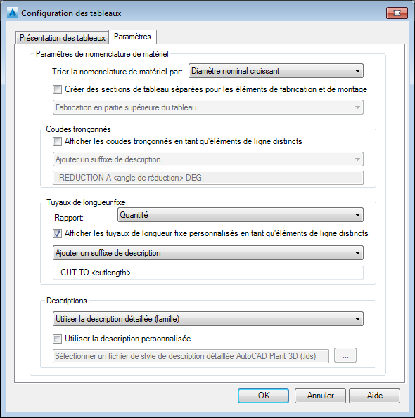- Sélectionnez ou désélectionnez Utiliser la description personnalisée. Si vous sélectionnez cette option, cliquez sur le bouton [...] pour localiser le style de description détaillée AutoCAD Plant 3D (.lds) voulu. Ce fichier définit le format de toutes les descriptions utilisées dans la nomenclature de matériel. Cliquez sur OK.