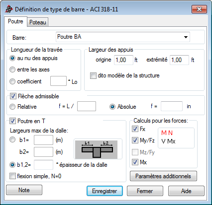 - Si l'option Poutre en T (dalle participante) est sélectionnée, le dimensionnement des dalles participantes (les poutres en T sont considérées comme faisant partie intégrante des dalles) est actif.