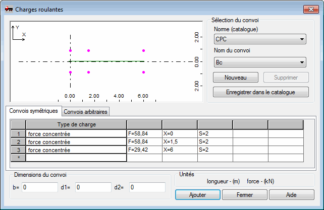 La définition du convoi peut être composée de forces concentrées, linéaires ou surfaciques au contour rectangulaire.