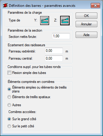 En sélectionnant une option dans ce champ, vous pouvez définir une fonction de barres à cornière simple dans une structure et la façon dont elles sont reliées avec des goussets. Selon l’option sélectionnée, Robot calcule l’élancement équivalent de l’élément en compression conformément au point 13.3.3. L’élancement calculé sera utilisé pour la vérification du flambement dans les directions Y et Z.