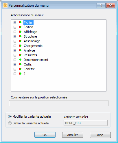 Dans cette boîte de dialogue, vous pouvez modifier la variante actuelle du menu ou en définir une nouvelle.