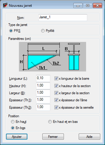 dans la boîte de dialogue Jarrets, le logiciel affiche la boîte de dialogue présentée ci-dessous dans laquelle vous pouvez définir un nouveau type de jarret.