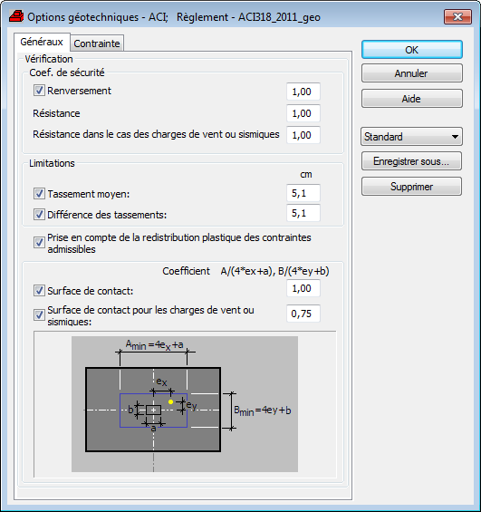 La boîte de dialogue Options géotechniques permet de définir les paramètres géotechniques selon lesquels le logiciel effectuera la vérification des semelles isolées et filantes et de leur interaction avec le sol.