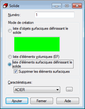 - Définissez la liste des éléments surfaciques (p. ex. après l'ouverture d'un fichier DXF contenant la géométrie de la structure) créant le contour du solide. Si l'option Supprimer éléments surfaciques est activée, le logiciel supprimera de la structure les éléments surfaciques définissant le contour du solide.