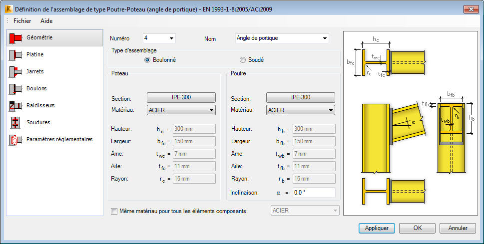 La partie centrale de la boîte de dialogue présente les paramètres géométriques et matériaux du poteau et de la poutre acier pour lesquels l'assemblage est créé.