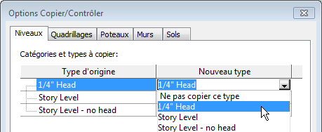 | empêcher que Revit copie des éléments d'un certain type | Recherchez le type d'élément dans la colonne Type d'origine. Sur la même ligne de la colonne Nouveau type, sélectionnez Ne pas copier ce type. |