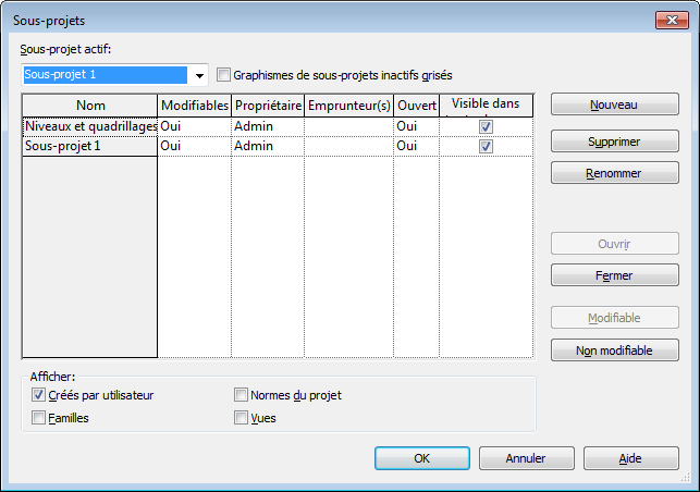 L'image suivante illustre la boîte de dialogue Sous-projets avec les deux sous-projets utilisateur par défaut, Quadrillages et niveaux partagés et Sous-projet 1.