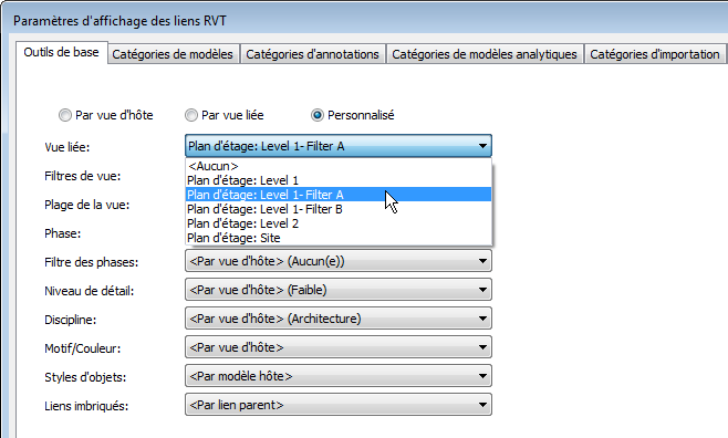 - Dans l'onglet Outils de base de la boîte de dialogue Paramètres d'affichage des liens RVT, effectuez les opérations suivantes :