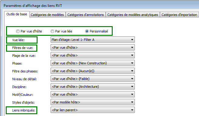 Pour contrôler l'utilisation des filtres pour des modèles liés dans une vue d'hôte, utilisez les paramètres de la boîte de dialogue Paramètres d'affichage des liens RVT.
