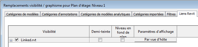 Si l'option Par vue d'hôte ne s'affiche pas, cliquez dans la colonne Paramètres d'affichage. Dans l'onglet Outils de base de la boîte de dialogue Paramètres d'affichage des liens RVT, sélectionnez Par vue d'hôte, puis cliquez sur OK.