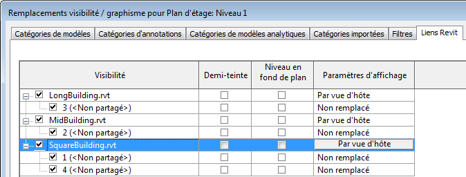 L'onglet Liens Revit de la boîte de dialogue Visibilité/Graphismes contient les colonnes suivantes :