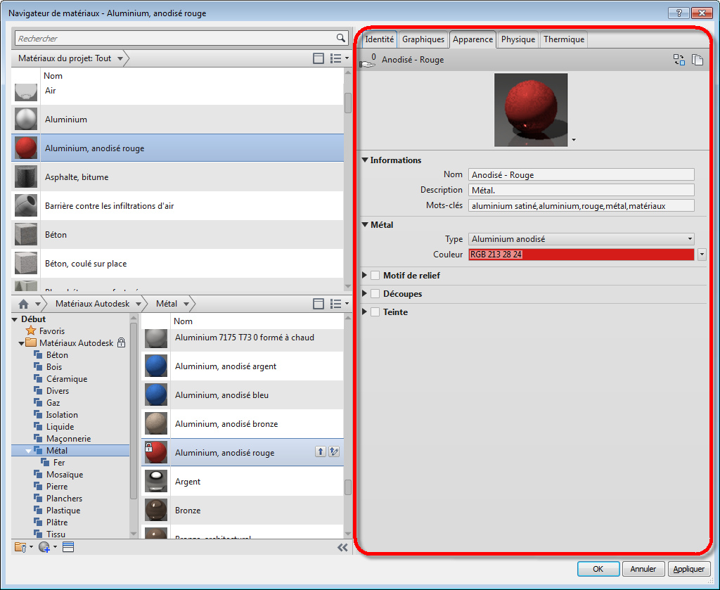Dans le navigateur de matériaux, les informations s'affichent dans les onglets Identité, Graphismes et Apparence de l'Editeur de matériaux.