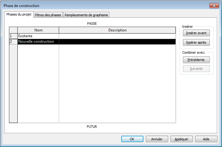 La boîte de dialogue Phase de construction s'ouvre avec l'onglet Phases du projet affiché. Par défaut, chaque projet possède des phases appelées Existante et Nouvelle construction.