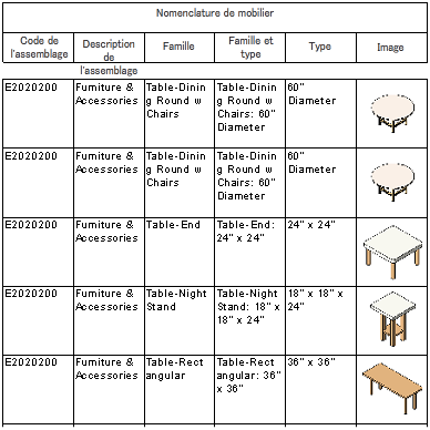 Les images que vous pouvez associer à un élément incluent notamment les images importées dans le modèle et les images que vous créez en enregistrant les vues du modèle (vues 3D ou de rendu) dans le projet. Si elles sont incluses dans la définition de nomenclature, les images s'affichent dans la fenêtre de nomenclature qui est placée sur une feuille. La vue de nomenclature inclut le nom de l'image, mais pas l'image. L'exemple suivant illustre une nomenclature de mobilier avec des images dans une vue de feuille.