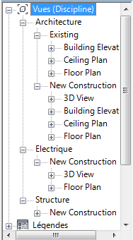 Par exemple, l'image suivante montre des vues de l'arborescence du projet organisées par discipline, puis par phase et par type de vue. Le niveau racine de la section Vues montre également le nom du groupe de tri actuellement appliqué (dans ce cas, il s'agit de Discipline).