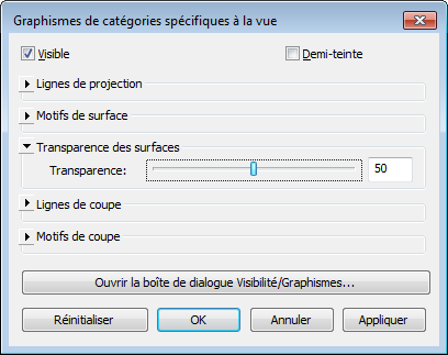 par élément. La boîte de dialogue Graphismes d'éléments spécifiques à la vue s'ouvre et affiche les paramètres de visibilité et d'affichage de graphismes en cours pour l'élément. Vous pouvez développer les catégories pour voir les détails des paramètres.