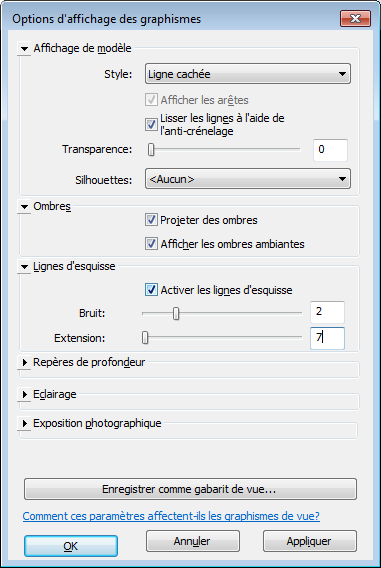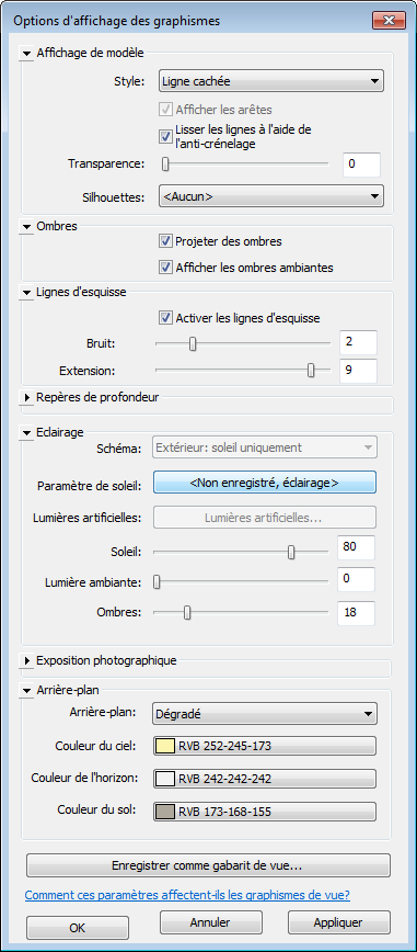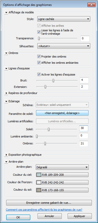 Cette vue utilise les paramètres suivants dans la boîte de dialogue Options d'affichage des graphismes :