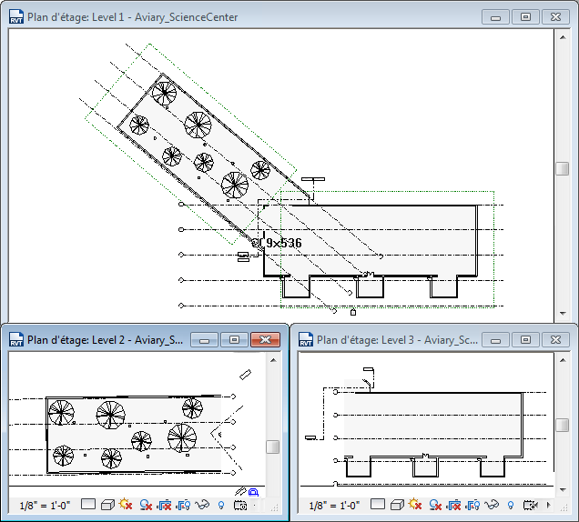 Par exemple, dans la vue située dans la partie supérieure de l'illustration ci-dessous, des zones de définition s'affichent autour du bâtiment principal et de l'aile aviaire. La zone de définition 1 a été appliquée aux lignes de quadrillage du bâtiment principal, tandis que la zone de définition 2 a été appliquée aux lignes de quadrillage de l'aile aviaire. Ainsi, seules les lignes de quadrillage appliquées à la partie adéquate du bâtiment s'affichent dans chacune des vues dépendantes (partie inférieure de l'illustration).