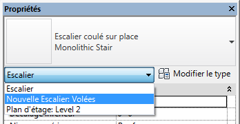 - Dans le Sélecteur de type, sélectionnez le type de l'escalier à créer. Vous pouvez modifier le type ultérieurement, si nécessaire.
