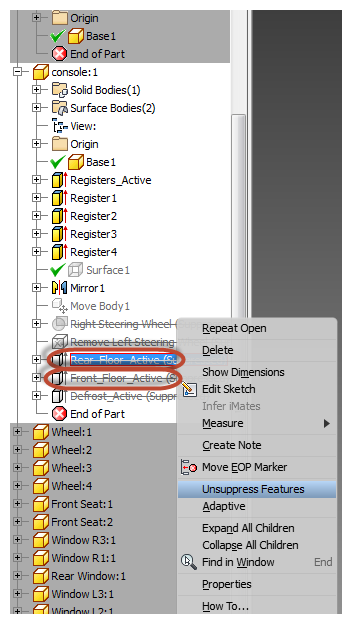 3. In the CAD model, enable the features that allow air to flow to the front floor and the rear floor registers. In the console part, activate the following features: