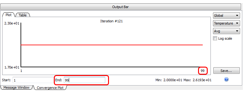 4. To determine if the flow solution converged before iteration 100, check for variations in the Temperature prior to iteration 100. Change the End: field to 99 and press the Enter key.