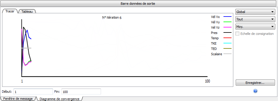 4. Une fois que l'analyse a démarré à l'issue du traitement du démarrage, la progression de la résolution est tracée sur la barre des données de sortie du Contrôle de la convergence :