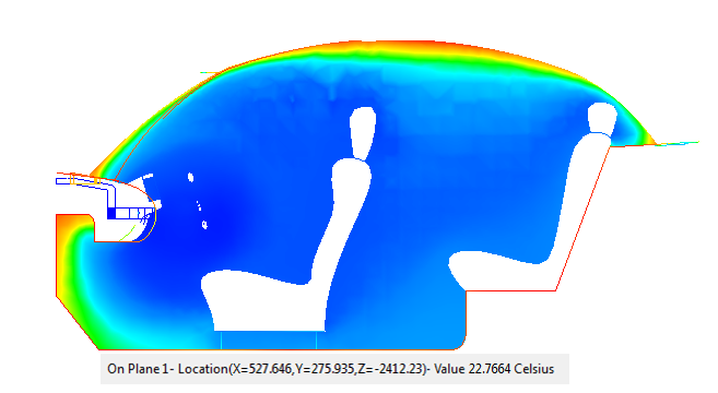 4. Faites pivoter le plan de résultats en faisant glisser la souris sur l'arc de trièdre affiché ci-dessous. Cette technique permet d'étudier la distribution de température dans l'ensemble de l'habitacle.