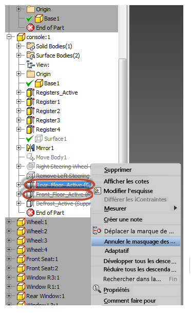 3. Dans le modèle CAO, activez les fonctions qui permettent à l'air de circuler vers les registres du plancher avant et arrière. Dans la pièce console, activez les fonctions suivantes :