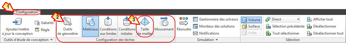 Les contrôles dans Configuration > Configuration des tâches et Résultats > Tâches de résultats appellent des modes de tâche spécifiques qui constituent les étapes fondamentales du processus Autodesk Simulation CFD. Vous trouverez plusieurs contrôles usuels relatifs à la tâche active dans un panneau contextuel supplémentaire situé à droite du ruban.